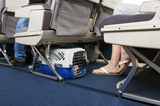 Your pet can enter the cabin if it fits in an official travel bag that you place under the seat in front of you. You may not open it during the flight. The maximum allowable weight of your dog and the dimensions of the travel bag vary per airline. With this option, you stay together.
